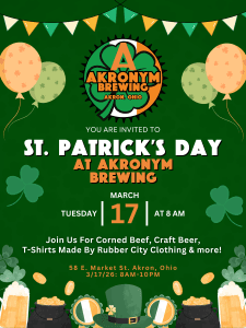 A few days remain to purchase gifts at Akronym Brewing! We’ve got shirts, Akronym beer glasses, gift cards, and more! We will be closed on Christmas Eve as well as Christmas Day. Don’t forget we are closed on Sundays!